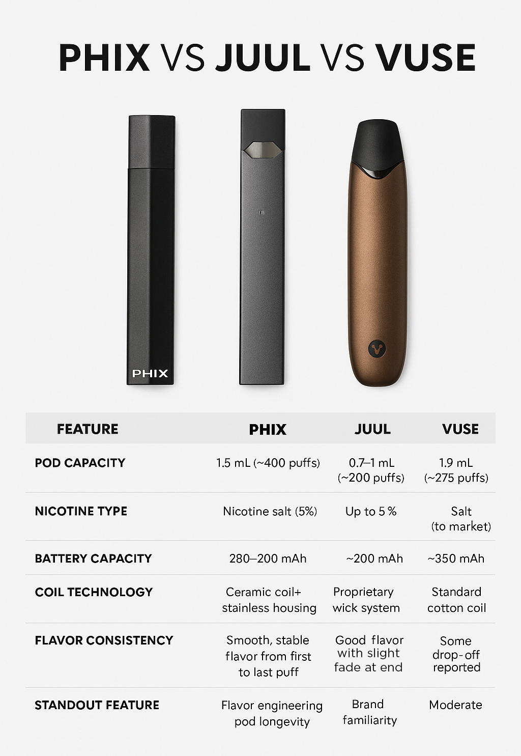 Let’s break down how PHIX compares, where it leads the pack, and what makes it a favorite for vapers who value flavor, simplicity, and reliability.